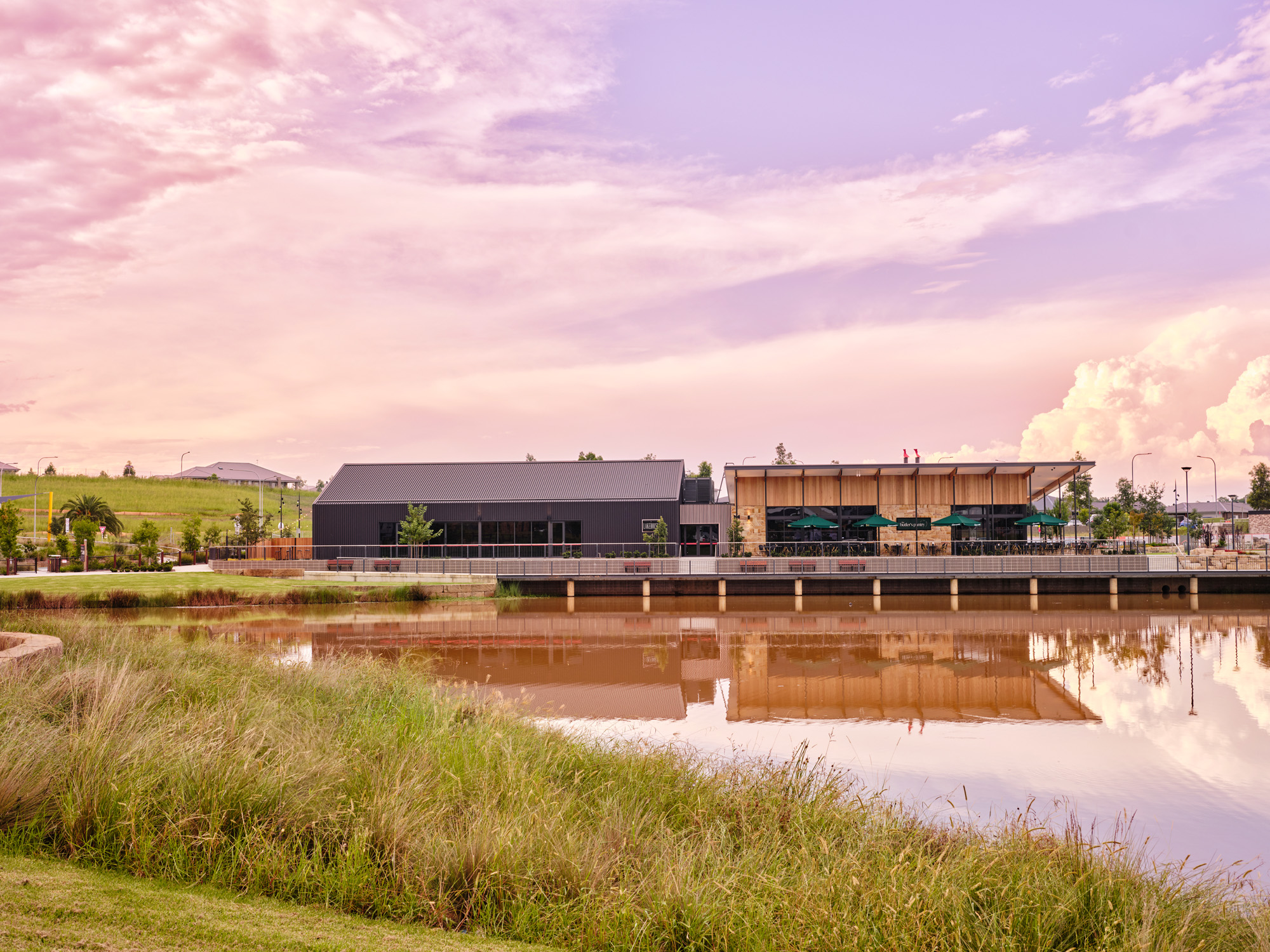 The Lakehouse architecture is breathtaking. Our establishment features Mount White Sandstone, sleek matte black framework, Victorian Ash timber cladding, and Tasmanian Oak glulam rafters. The elegant yet contemporary ambience eliminates the need for additional decor. Captivating water views frame dramatic high ceilings and modern interiors.